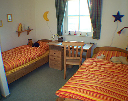 Eingerichtet für zwei Kinder finden sie hier ein kleines Paradies zum Wohlfühlen und Spielen. Ein Schreibtisch lädt zum Malen, Basteln oder Schreiben ein. Im Einbauschrank sowie in der Kommode ist Platz für Kleidung und Spielzeug. Aber auch “große Kinder” werden sich hier wohl fühlen, da die Betten das Standardmaß 90 x 200 cm haben. Leselampen und kindgerechte Dekoration sorgen dafür, das Ihre Kinder sich hier sofort wie zu Hause fühlen werden. Auch hier haben wir ein Verdunklungsrollo am Fenster angebracht, damit die Kinder nicht mit der Sonne aufstehen und auch ein Mittagsschlaf möglich ist. Die Betten wurden ebenfalls mit hochwertigen Matratzen und Lattenrosten ausgestattet und ermöglichen so einen ruhigen Schlaf.